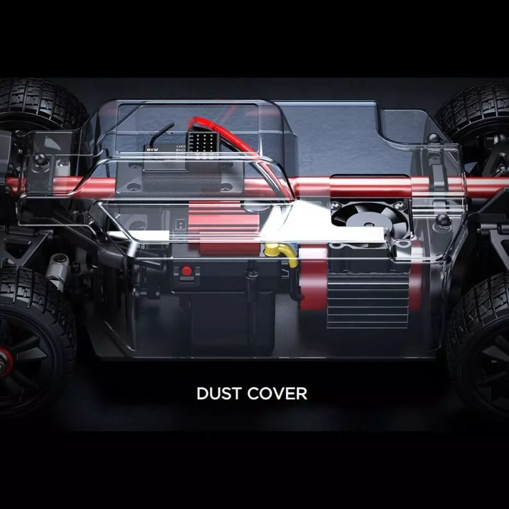 MJX Hyper GO 14303 (RTR), trasmettitore a 2,4 GHz, tre diversi set di pneumatici, batteria da 7,4 V 2000 mAh, cavo di ricarica USB, strumenti e manuale utente.