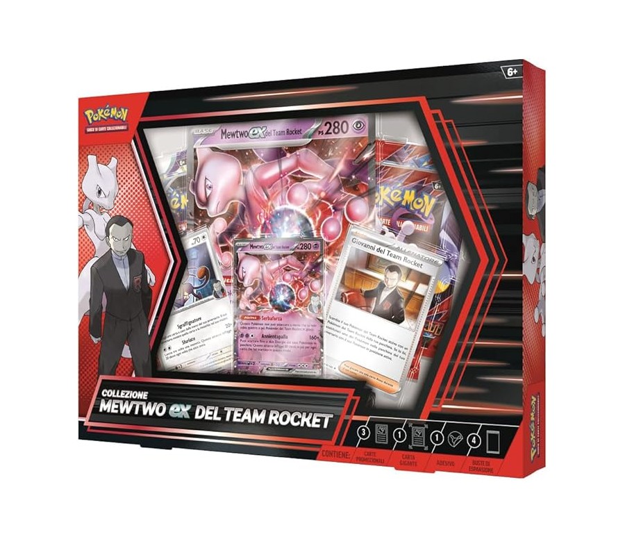 • Set contenente:2 carte olografiche di Meowth e Giovanni del Team Rocket, carta promozionale olografica di Mewtwo-ex, 1 carta olografica gigante di Mewtwo -ex del Team Rocket, 1 fotoadesivo, 4 buste di espansione del GCC Pokemon, 1 carta codice per il GCC Pokemon Live.